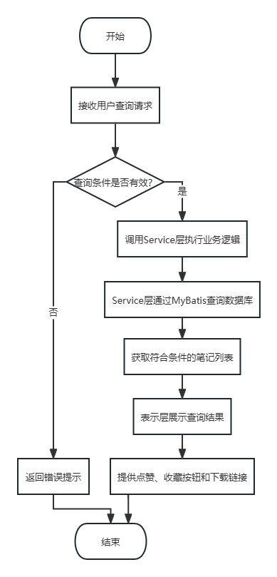 课堂笔记查询功能允许用户搜索、点赞、收藏和下载笔记。Controller接收用户查询请求,调用Service层执行业务逻辑。Service层通过MyBatis查询数据库,获取符合条件的笔记列表。表示层将查询结果以列表形式展示,并提供点赞、收藏按钮和下载链接。用户通过客户端操作实现笔记的查看和相关操作。如图4-2所示。