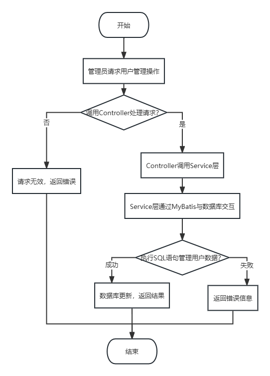 系统用户管理功能由管理员使用,包括查询、重置、删除、添加和查看用户详情。Controller接收管理员请求,调用Service层执行相应操作。Service层通过MyBatis与数据库交互,执行SQL语句管理用户数据。表示层为管理员提供用户管理界面,展示用户列表和操作选项。管理员通过客户端界面进行用户管理操作,系统响应并更新数据库。系统用户管理流程图如图4-4所示。