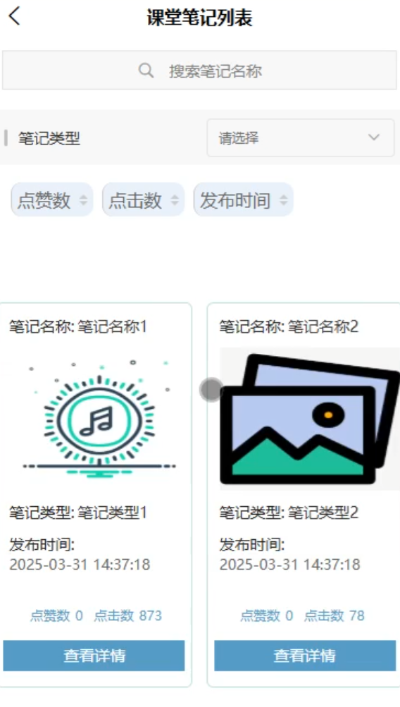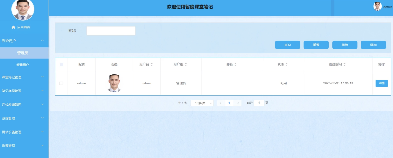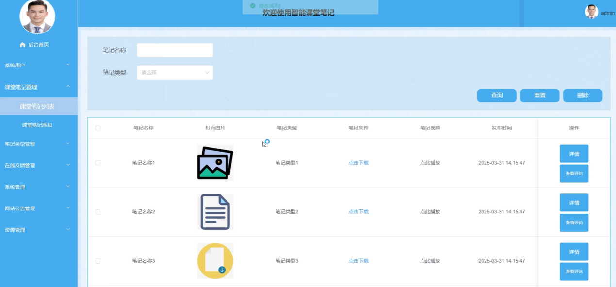 管理员在课堂笔记管理界面中,添加课堂笔记列表、查询、重置、删除、添加详情以及查看评论。管理员可以审核笔记内容,确保信息准确无误。课堂笔记管理界面如图5-8所示。