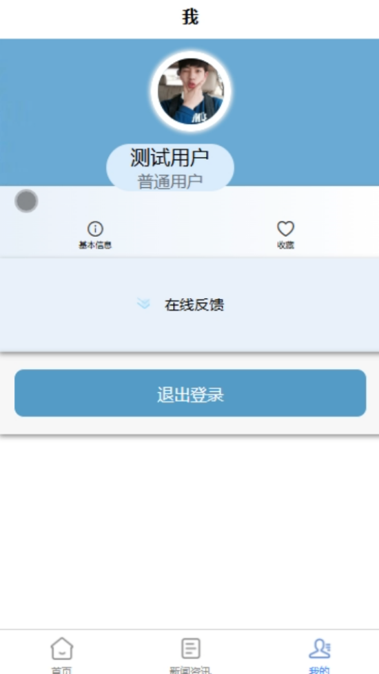 用户在个人中心界面中,管理基本信息、查看收藏内容、提交在线反馈及退出登录。用户可以更新个人信息,查看历史反馈记录和管理收藏列表。个人中心界面如图5-6所示。