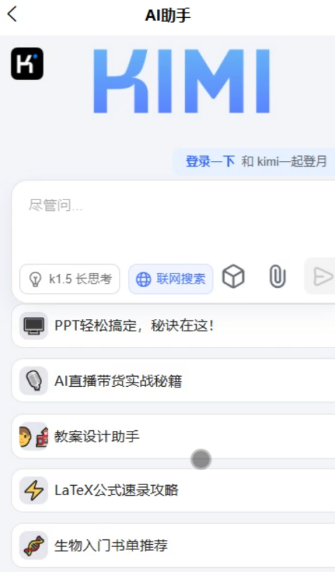 用户在AI助手界面中,与kimi进行对话。用户输入问题,系统通过自然语言处理提供回答。AI助手支持学习辅导和答疑,提升用户学习体验。AI助手界面如图5-5所示。