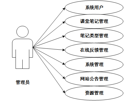 管理员功能涵盖:系统用户管理,包括管理员和普通用户的查询、重置、删除、添加和详情查看;课堂笔记管理,涉及课堂笔记列表的添加、查询、重置、删除、详情查看和评论查看;笔记类型管理,支持查询、重置、删除、添加和详情查看;在线反馈管理,包括查询、重置、删除、添加、详情查看和审核;系统管理,负责轮播图的查询、重置、删除、添加和详情查看;网站公告管理,支持查询、重置、删除、添加和详情查看;资源管理,包括新闻资讯分类的查询、重置、删除、添加和详情查看。管理员用例图如图3-2所示。