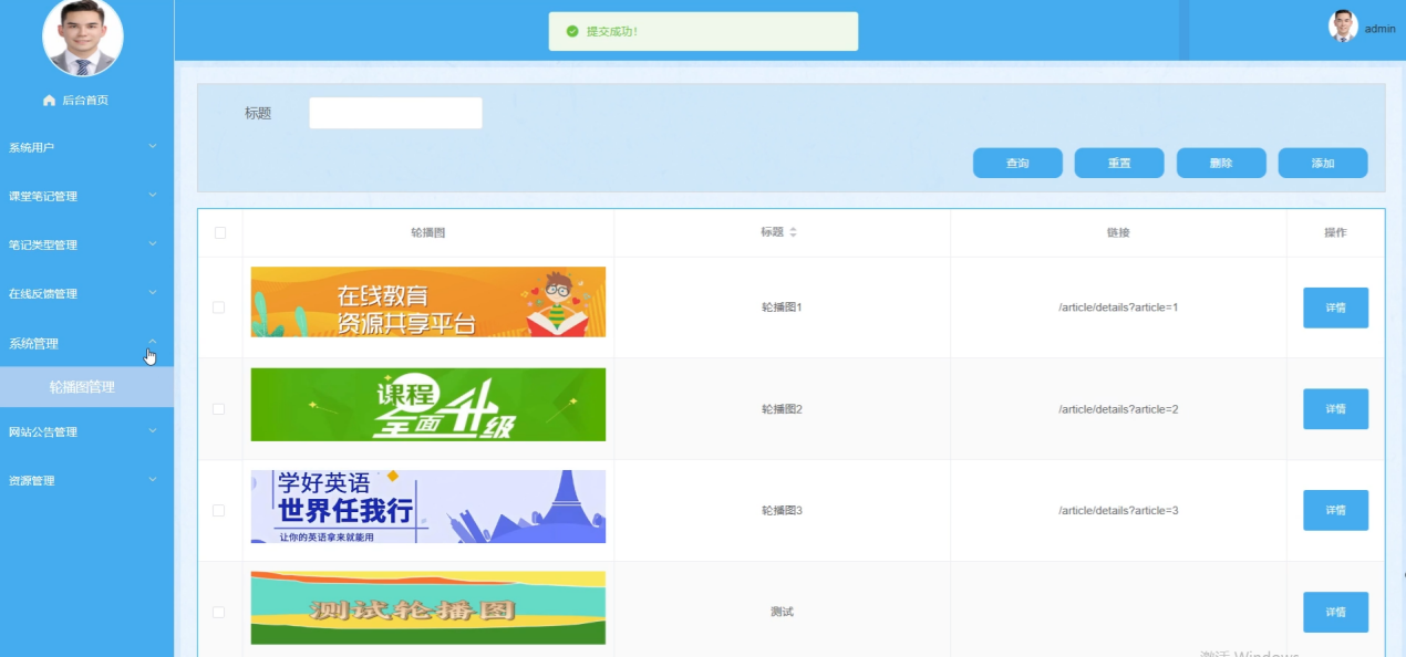 管理员在系统管理界面中,进行轮播图管理,包括查询、重置、删除、添加和查看详情操作。管理员可以更新首页的轮播内容,吸引用户关注。系统管理界面如图5-11所示。