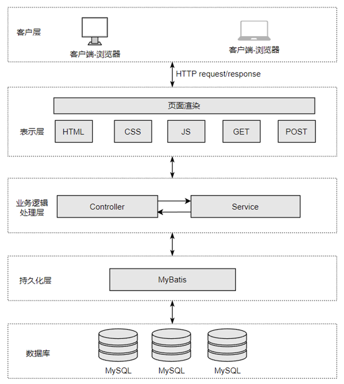 整个系统架构设计旨在实现模块化开发,各层之间职责明确,耦合度低,便于系统的维护和扩展。客户端层与表示层协同工作,完成用户界面的展示和用户操作的响应;业务逻辑处理层负责处理具体的业务需求,实现系统的业务功能;持久化层和数据库层负责数据的存储和管理,确保数据的安全性和一致性。系统架构如图4-1所示。