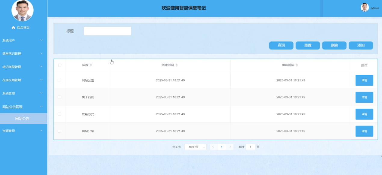 管理员在网站公告管理界面中,执行查询、重置、删除、添加和查看详情操作。管理员可以发布和管理系统公告,确保用户及时获取重要信息。网站公告管理界面如图5-12所示。