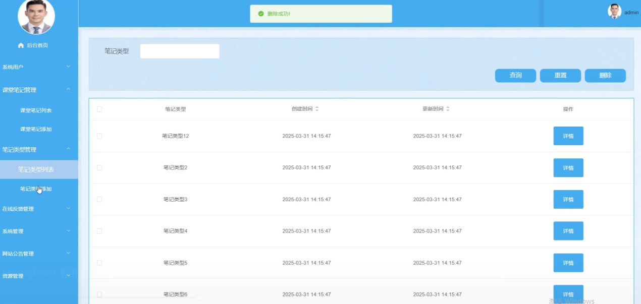 管理员在笔记类型管理界面中,进行笔记类型的查询、重置、删除、添加和查看详情操作。管理员可以管理系统中的笔记分类,确保用户能够方便地找到所需类型的笔记。笔记类型管理界面如图5-9所示。