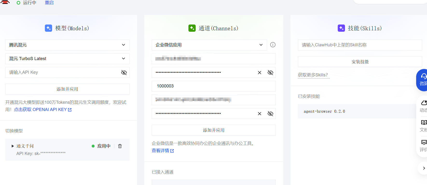 操作流程清晰:从服务器创建、模型配置到通道和技能设置,整个流程步骤明确、操作简单,适合中小企业快速上手,无需专业开发团队即可完成部署。