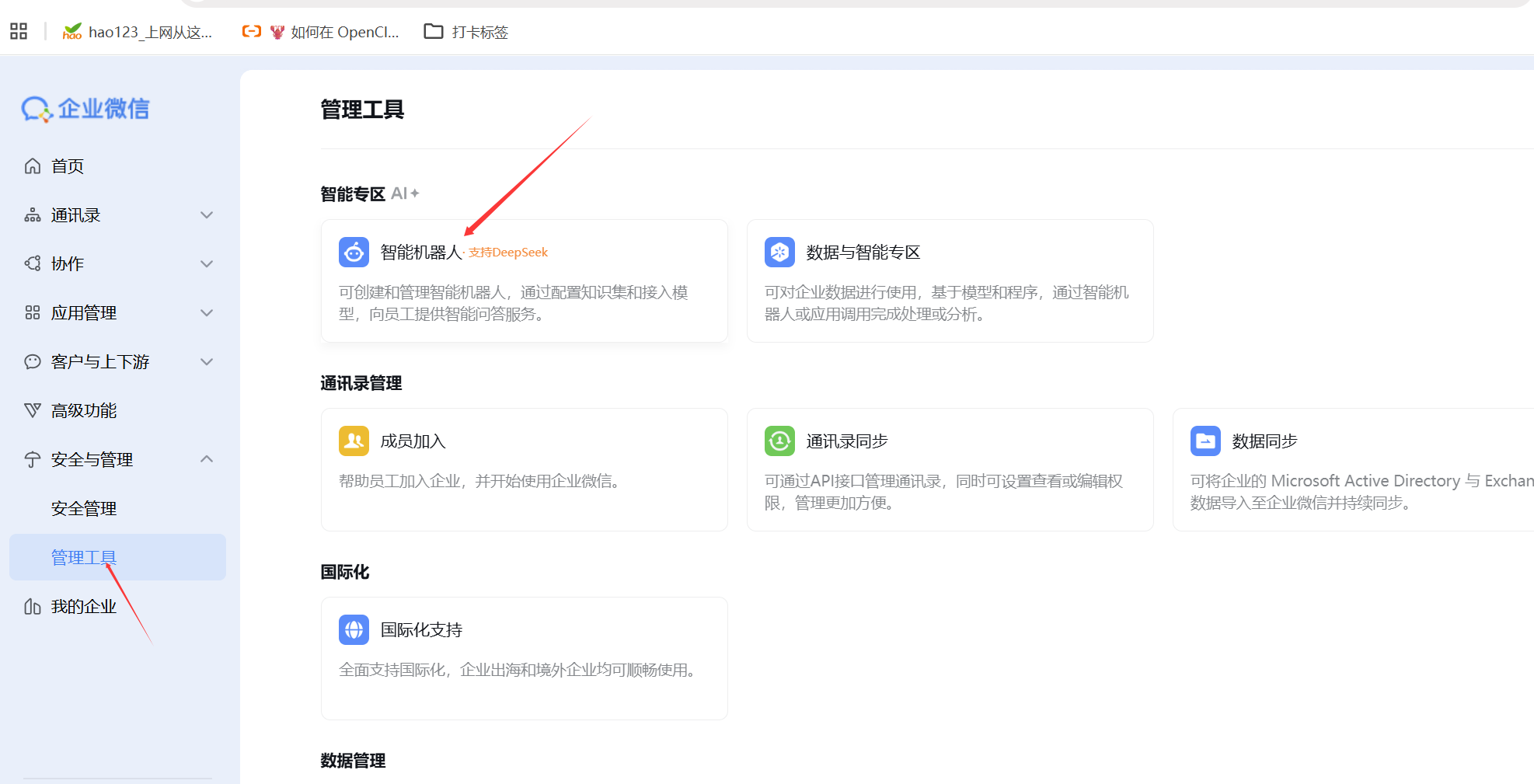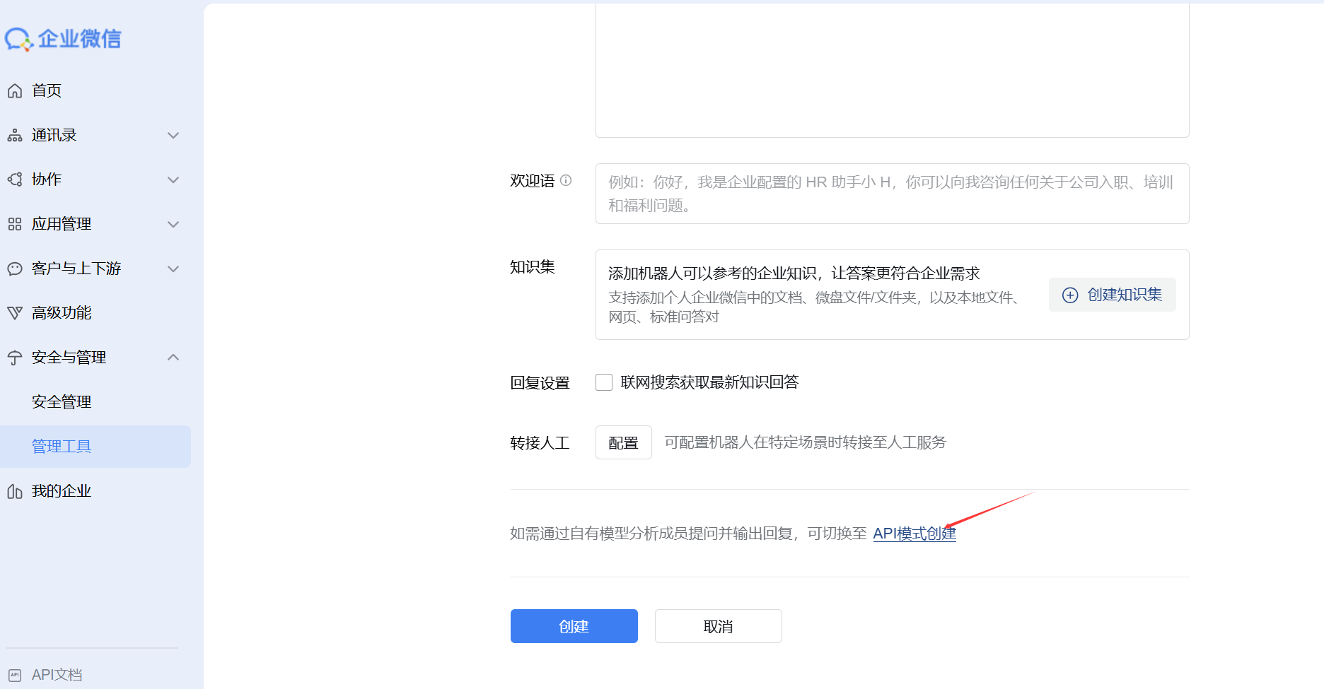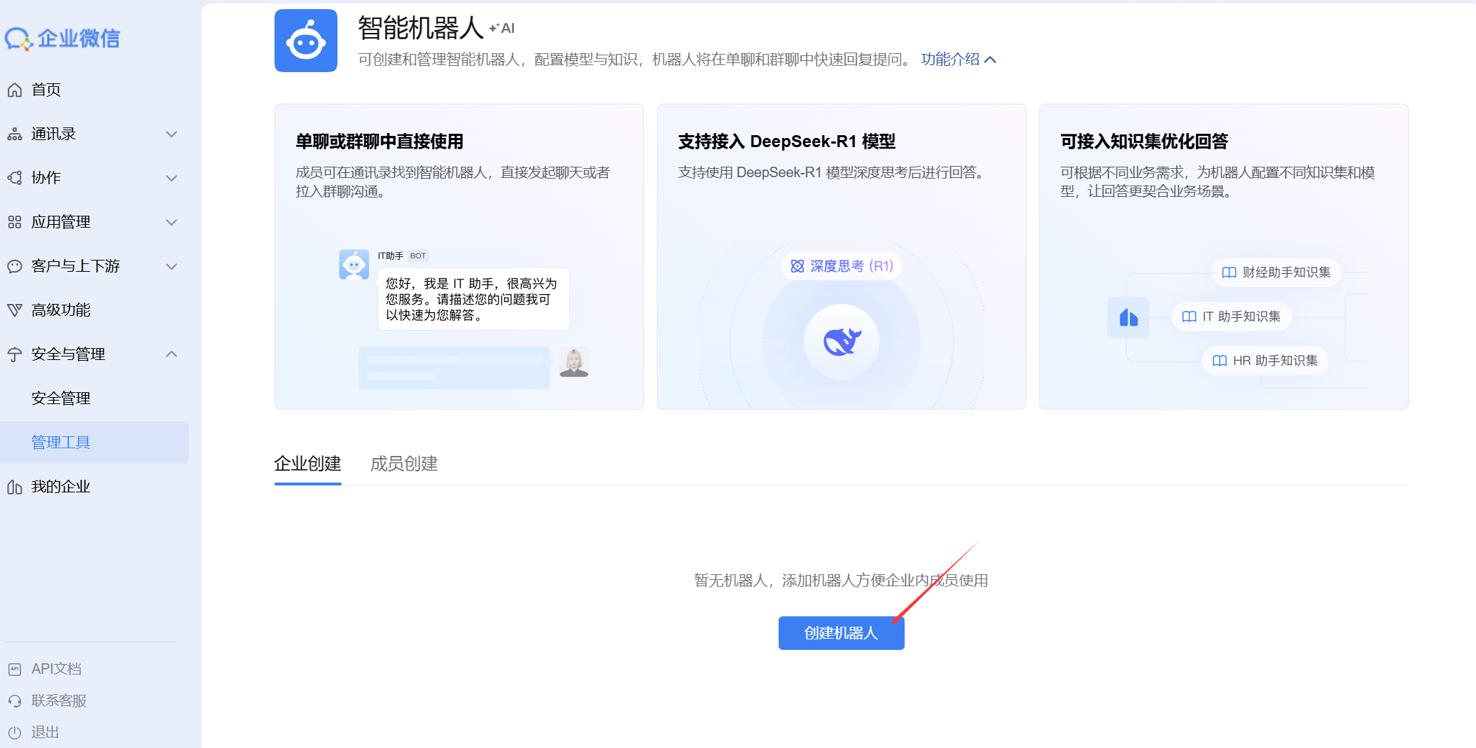 1)在企业微信管理后台左侧导航依次找到并进入安全与管理 > 管理工具,选择智能机器人,然后在页面内点击创建机器人。
