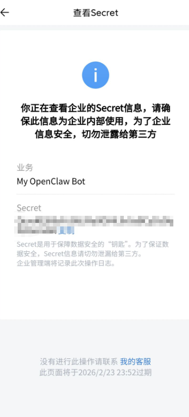 Corp Secret,在应用详情页内,找到Secret,并点击查看按钮,在弹窗中点击发送,在企业微信中查看。