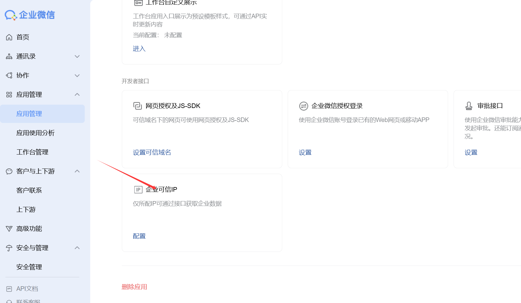 5)在应用管理页面最下面,配置企业可信IP,填入openclaw服务器公网IP即可。