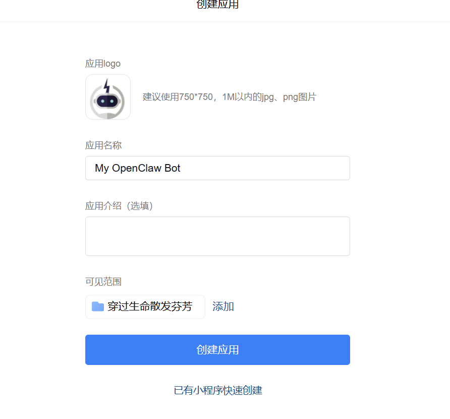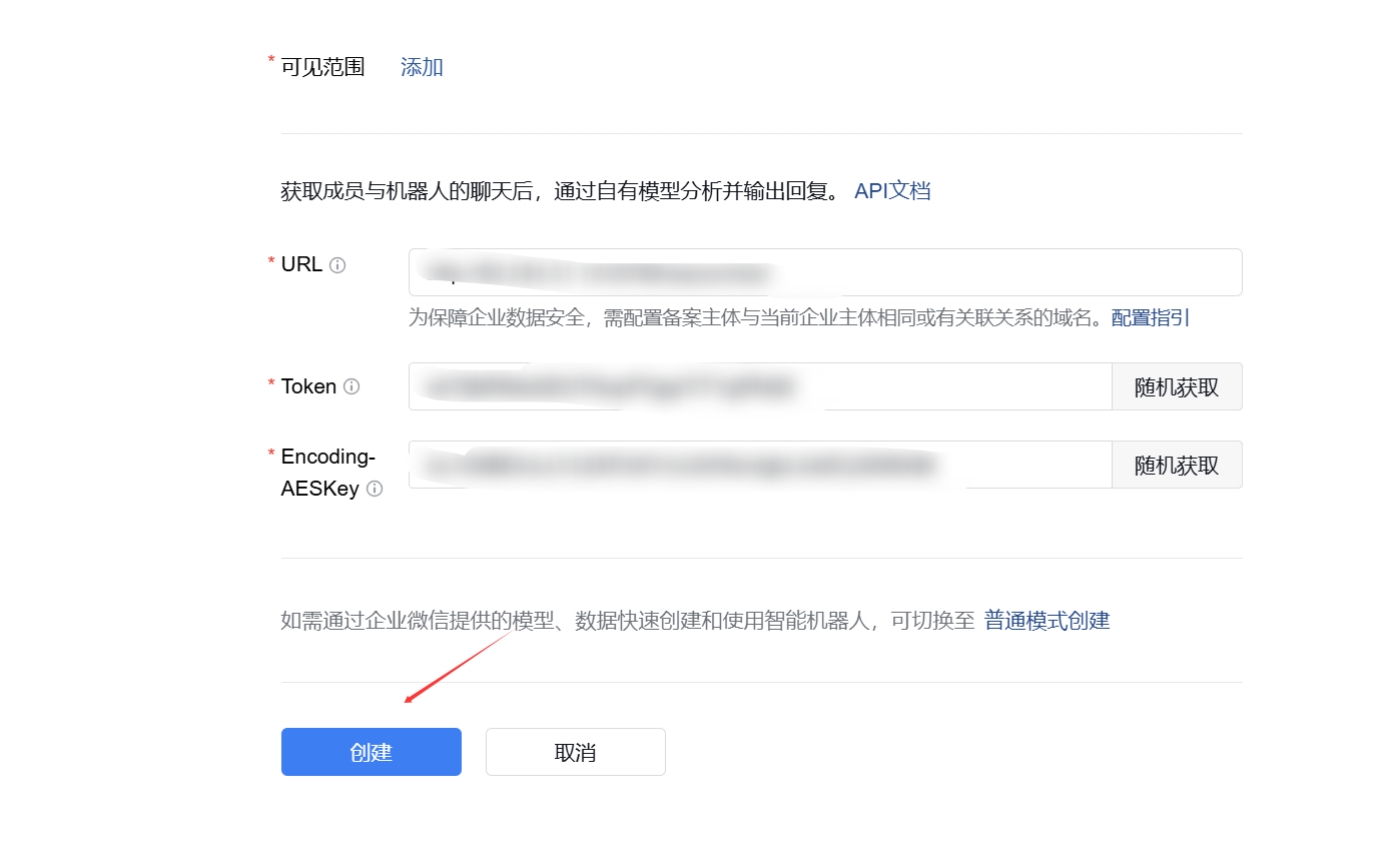3)在切换后的页面,依次填写名称、简介、可见范围、URL,并且点击随机获取按钮生成Token和Encoding-AESKey(这是企业微信与OpenClaw进行加密通信的密钥)。注意:此处先不用点击“创建”按钮。