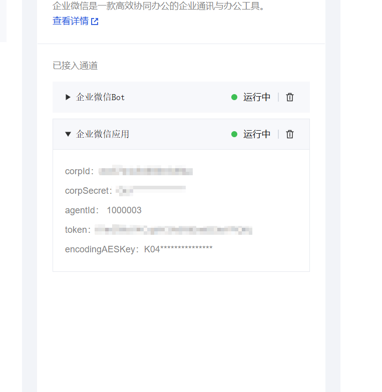 4)进入应用管理页面,选择通道配置,选择企业微信,然后依次在输入框内输入前文创建企业微信机器人时随机生成的 Token 和 EncodingAESKey 。