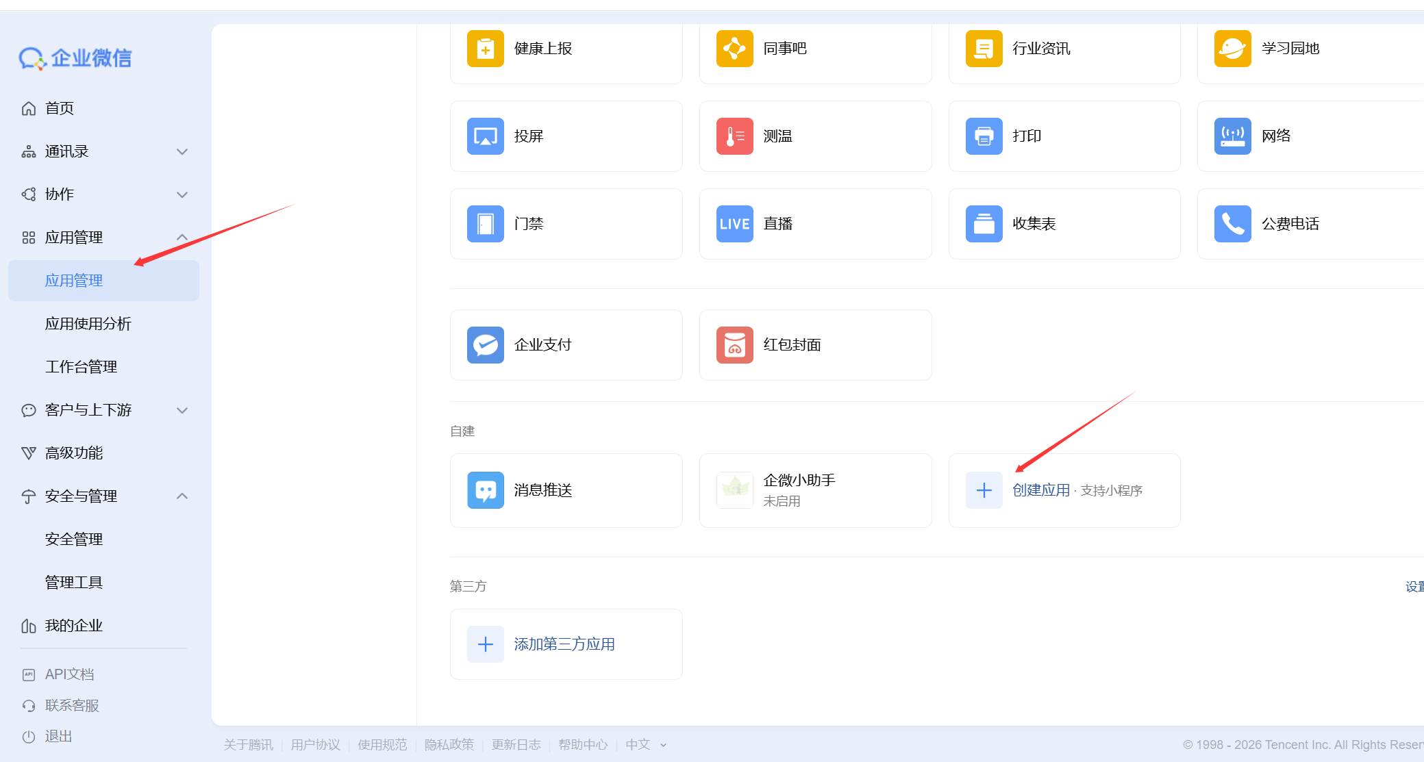 1)登录企业微信管理后台,进入应用管理 > 应用页面,在自建位置单击“创建应用”。