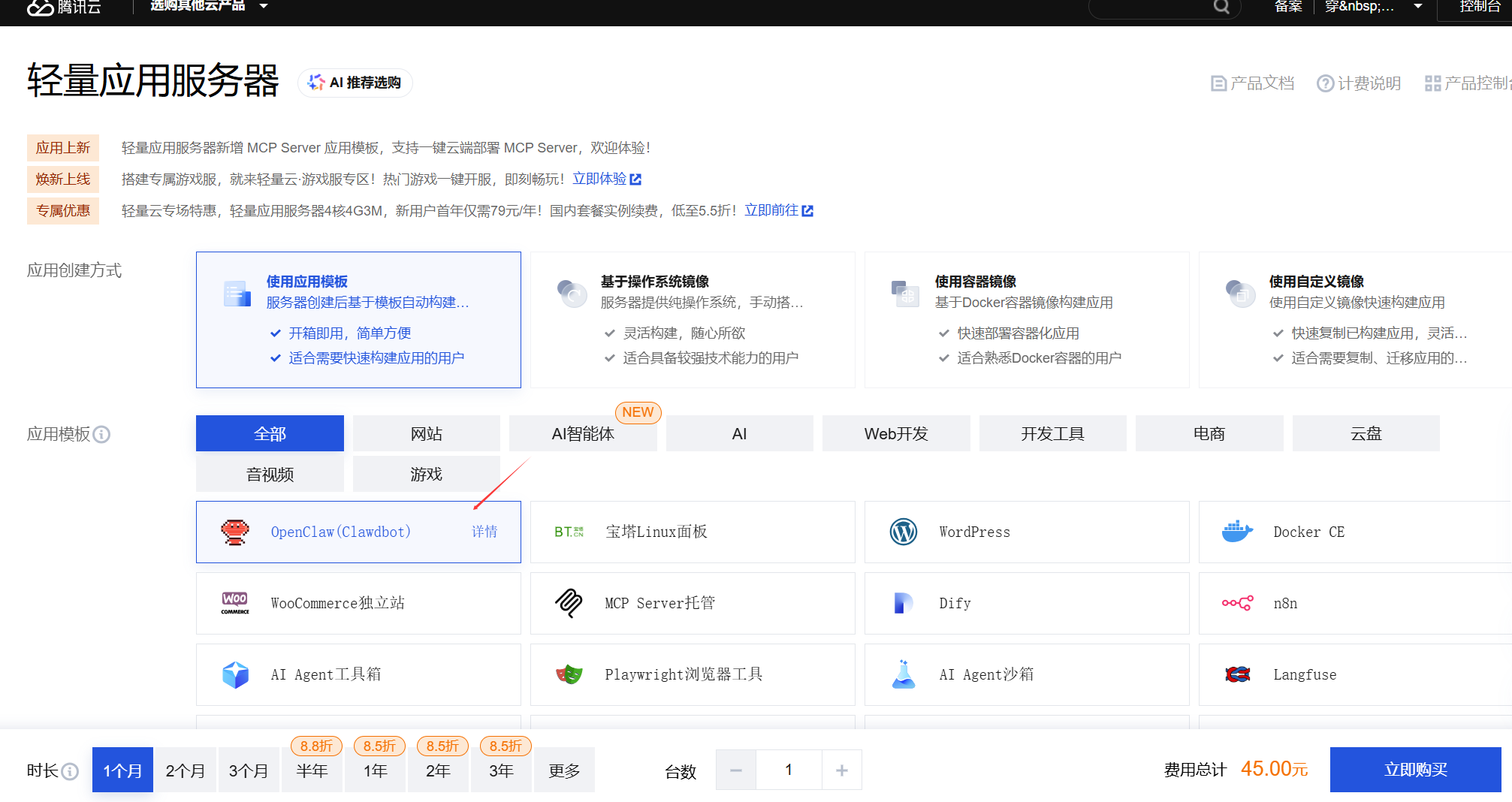 2、创建实例,使用应用模板,选择OpenClaw。若是新用户,可以免费试用一个月。