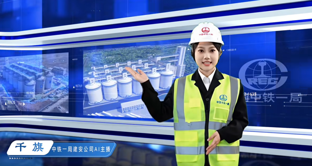中铁一局建安公司AI数字人主播“千旗”,通过AI技术结合深度学习算法,能精准复刻微表情、标志性动作及发音习惯,完成身体动作、表情管理、口型匹配和声音同步等功能。