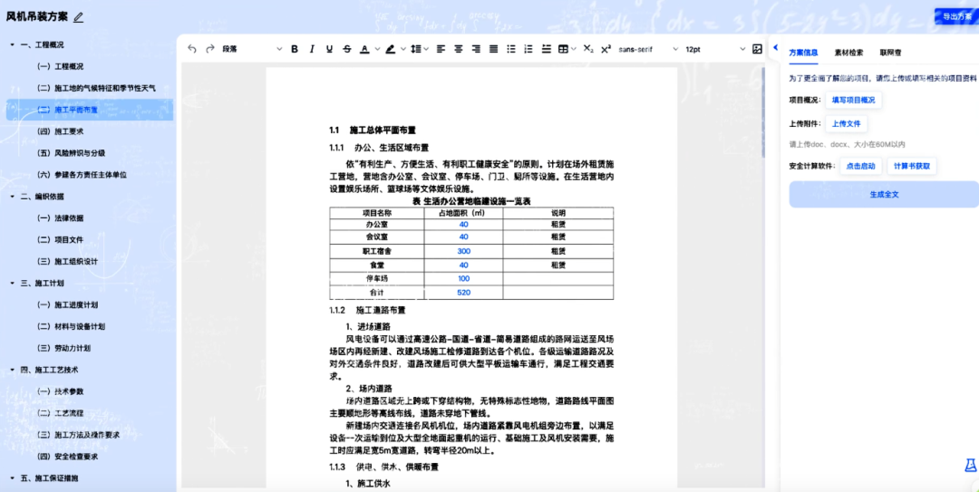 施工方案、技术交底、质量交底等工程文档人工编写流程繁琐、耗时久,编写人员水平不一,易出现格式错误、内容遗漏等问题。