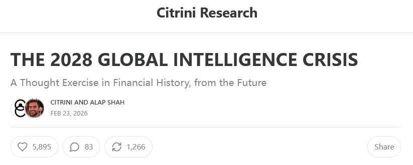 Citrini Research发布了一篇《2028全球智能危机》万字长文。