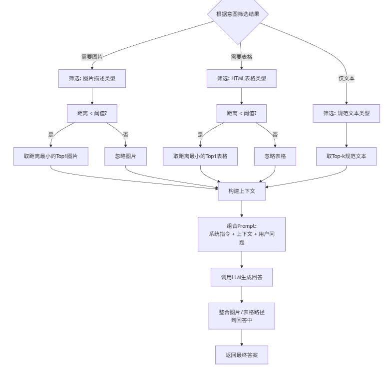 用户输入查询问题时,代码会生成查询向量,在FAISS索引中获取所有相似结果并排序;同时也会对用户意图进行检测,看是否需要附上相关图片或表格。