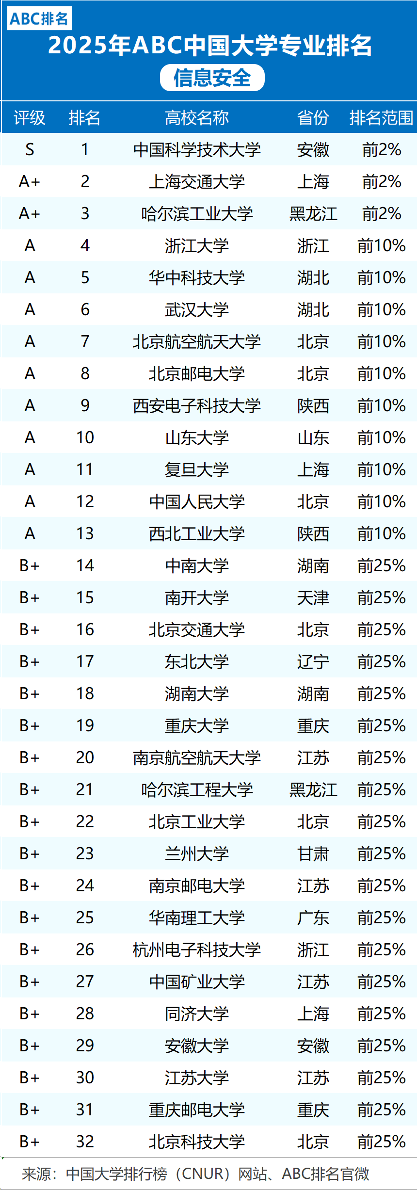 中国大学专业排名—信息安全专业前25%
