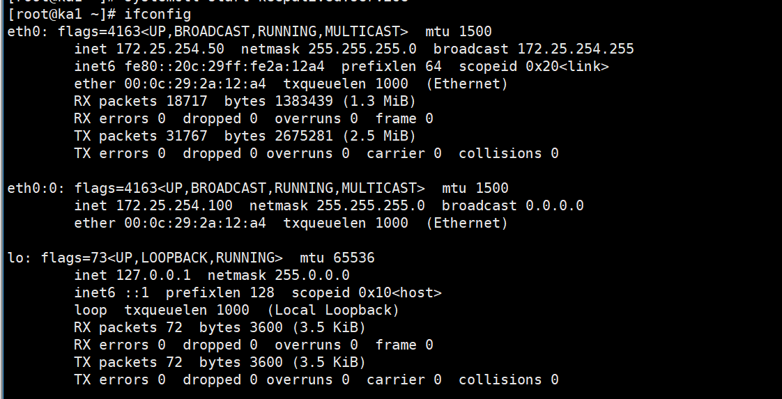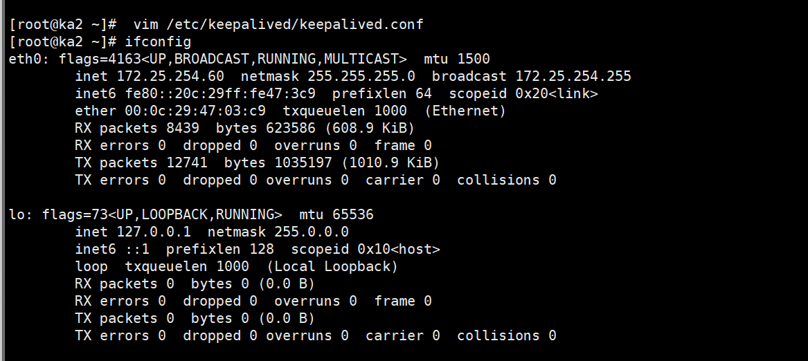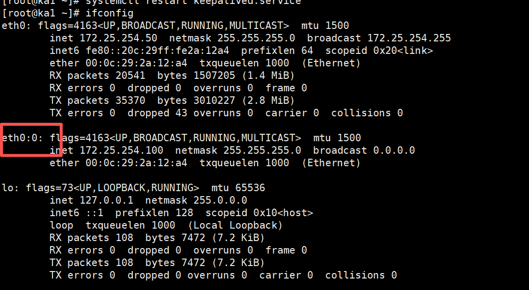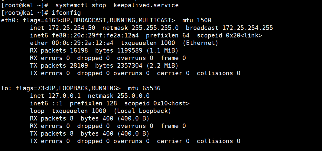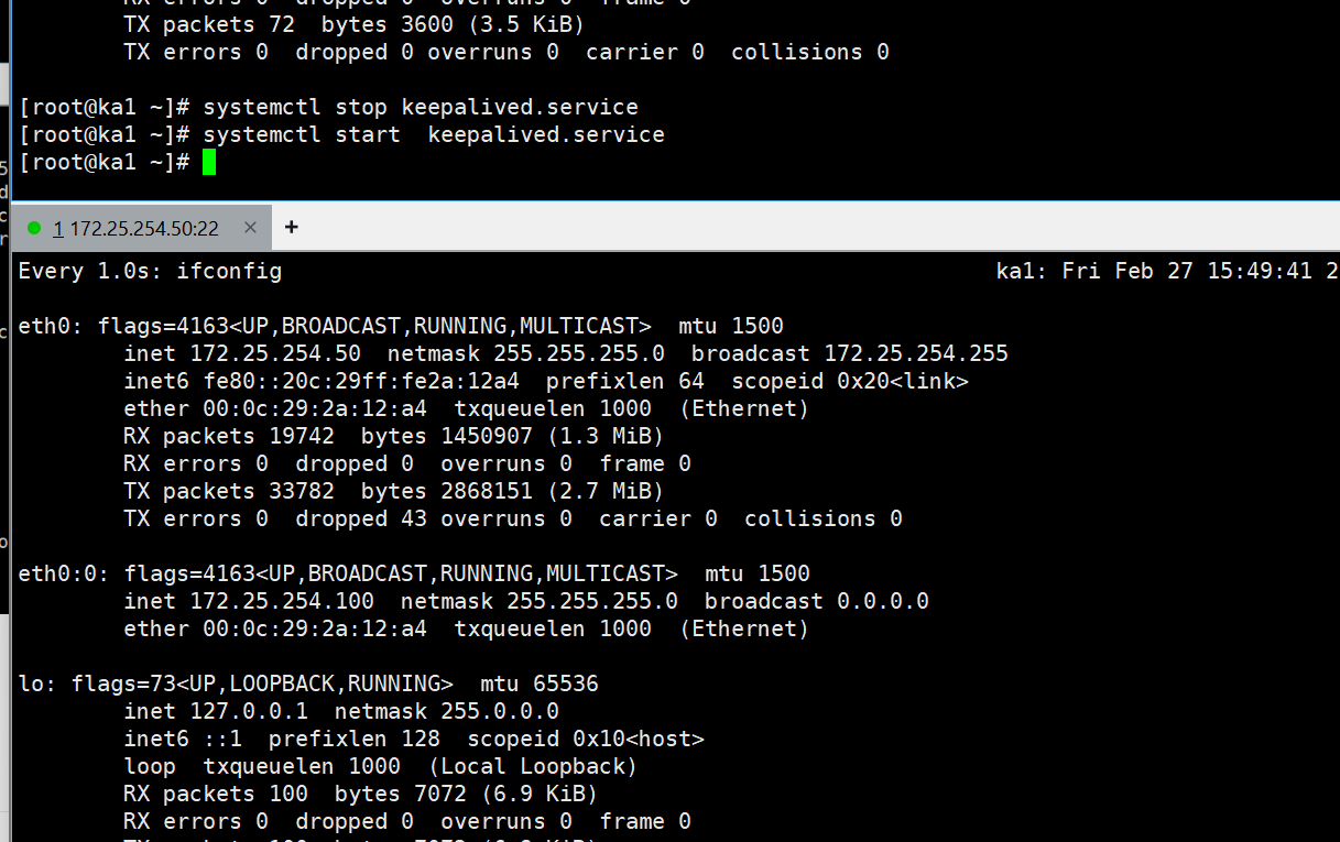 再次关闭ka1的keepalive服务VIP在ka2上 再次开启ka1上的服务尽管ka1的优先级比较高但是vip依旧在ka2上