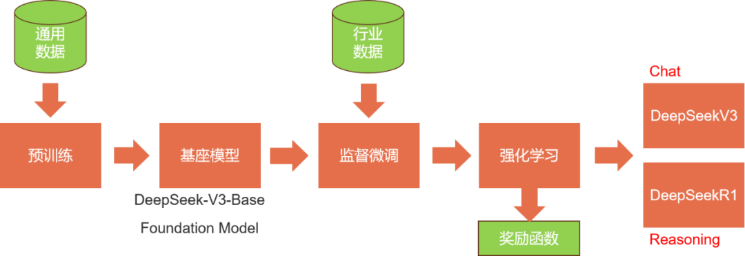 如图,我们都很熟悉DeepSeek有两种比较常用的模型,通用语言模型V3和推理增强模型R1,这两种模型实际都是在基座模型DeepSeek-V3-Base基础上经过监督微调和强化学习出来的。