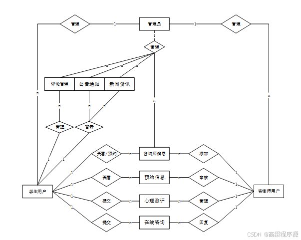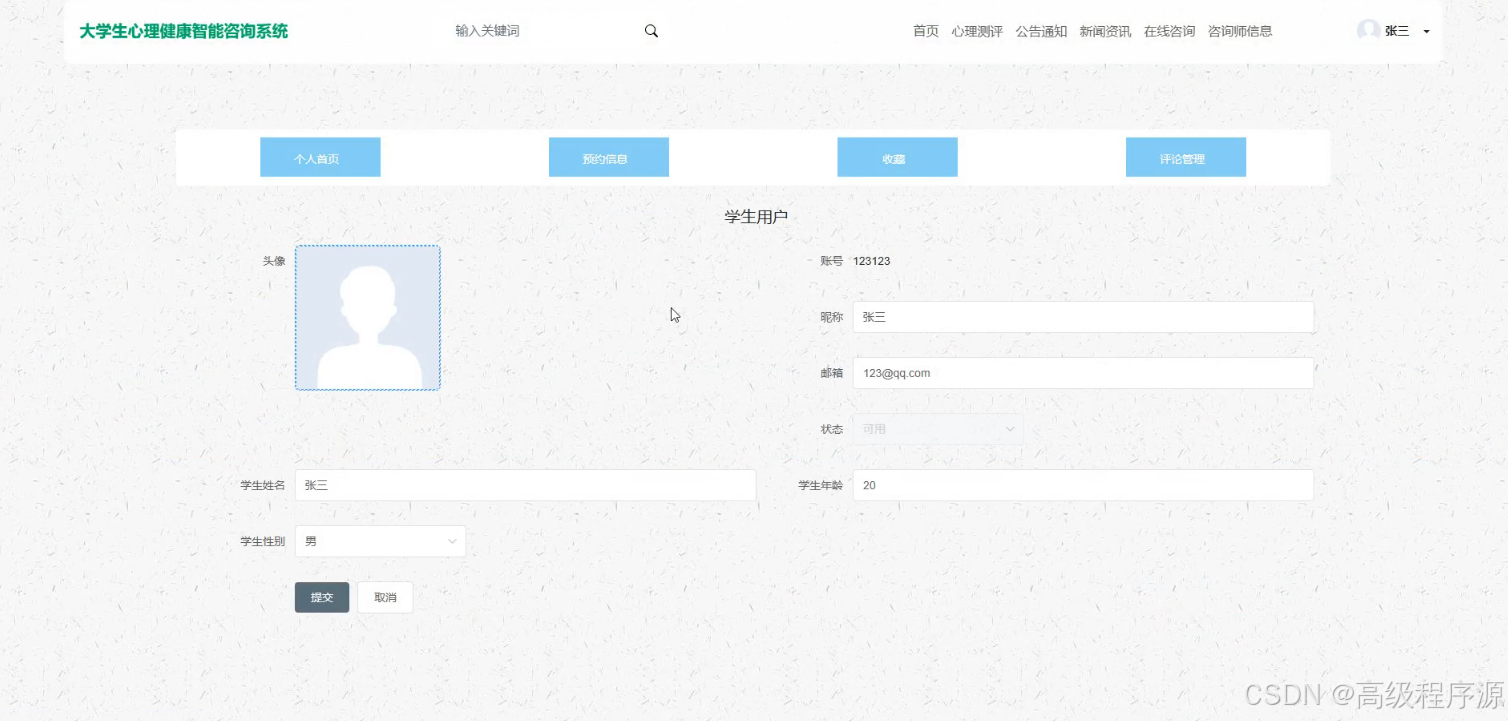 系统采用B/S架构,结合JAVA语言和MyBatis-Plus数据持久层技术实现多角色协同管理模式,包含学生用户、咨询师用户和管理员三大功能模块。学生端提供心理测评、AI智能问答、在线咨询、咨询师预约、新闻资讯交互等核心功能,支持点赞收藏、评论互动等社交行为,咨询师端集成预约审核、测评题库管理、在线咨询回复等专业服务功能,管理端通过实现权限控制,完成用户管理、资源维护、公告发布等系统级操作,构建了