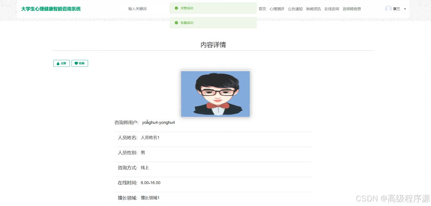 - 咨询师信息:展示咨询师的资质、擅长领域及用户评价,学生可查看详情并预约咨询服务。支持点赞、收藏或发表评论,收藏的咨询师信息可在个人中心统一管理。