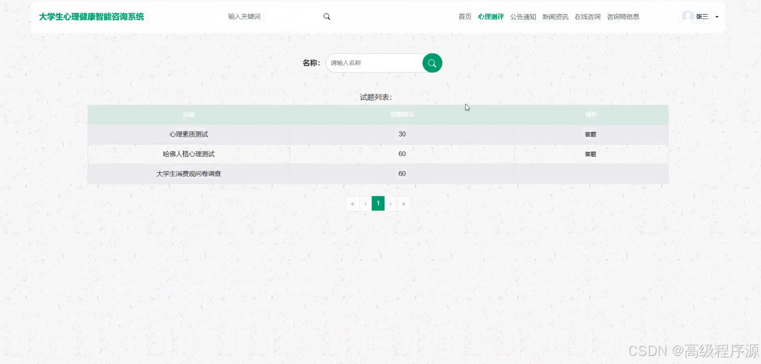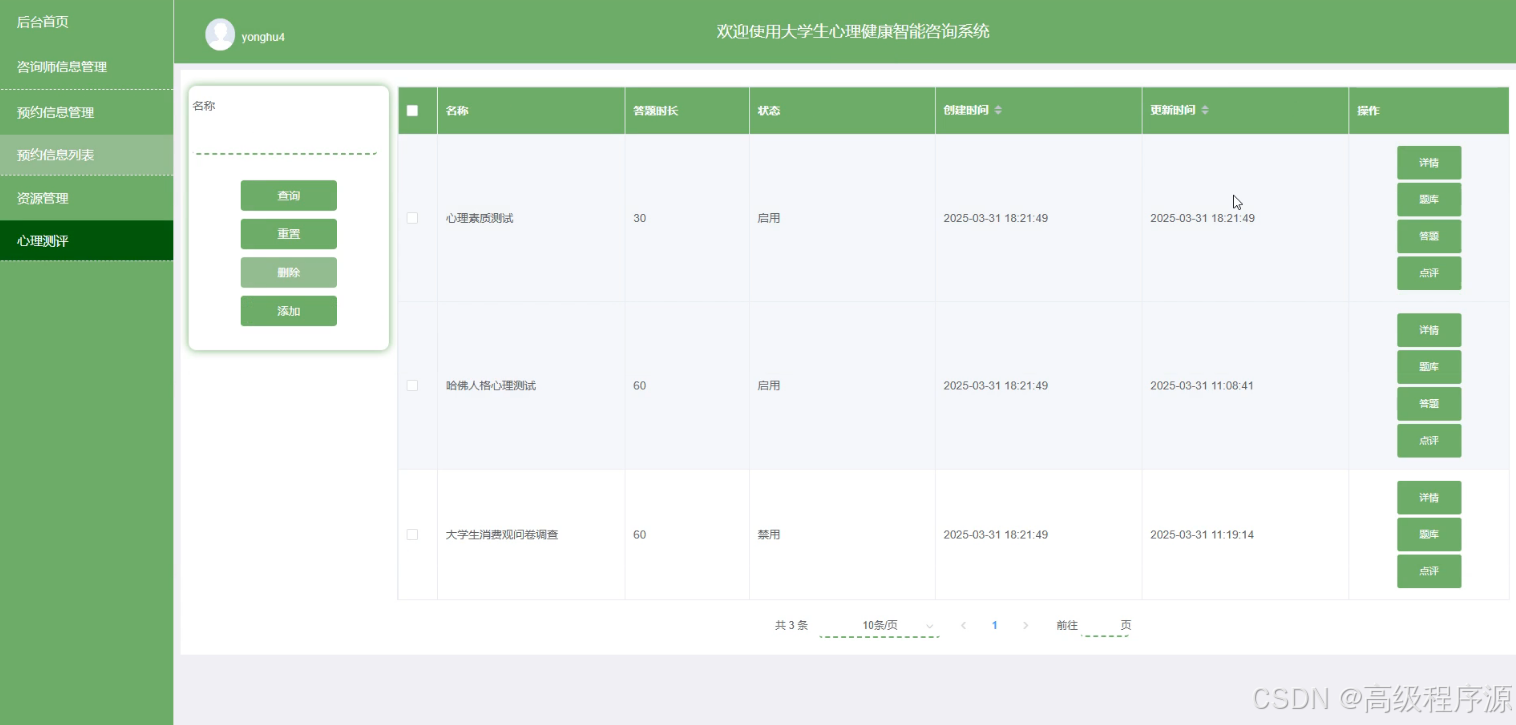 - 资源管理:资源管理模块允许咨询师用户添加和删除心理测评工具,以及管理题库内容。用户可以使用这些资源进行在线测评,并对测评结果进行点评。系统还支持答题功能,可以在线为用户提供测评服务,并提供专业的点评和建议。