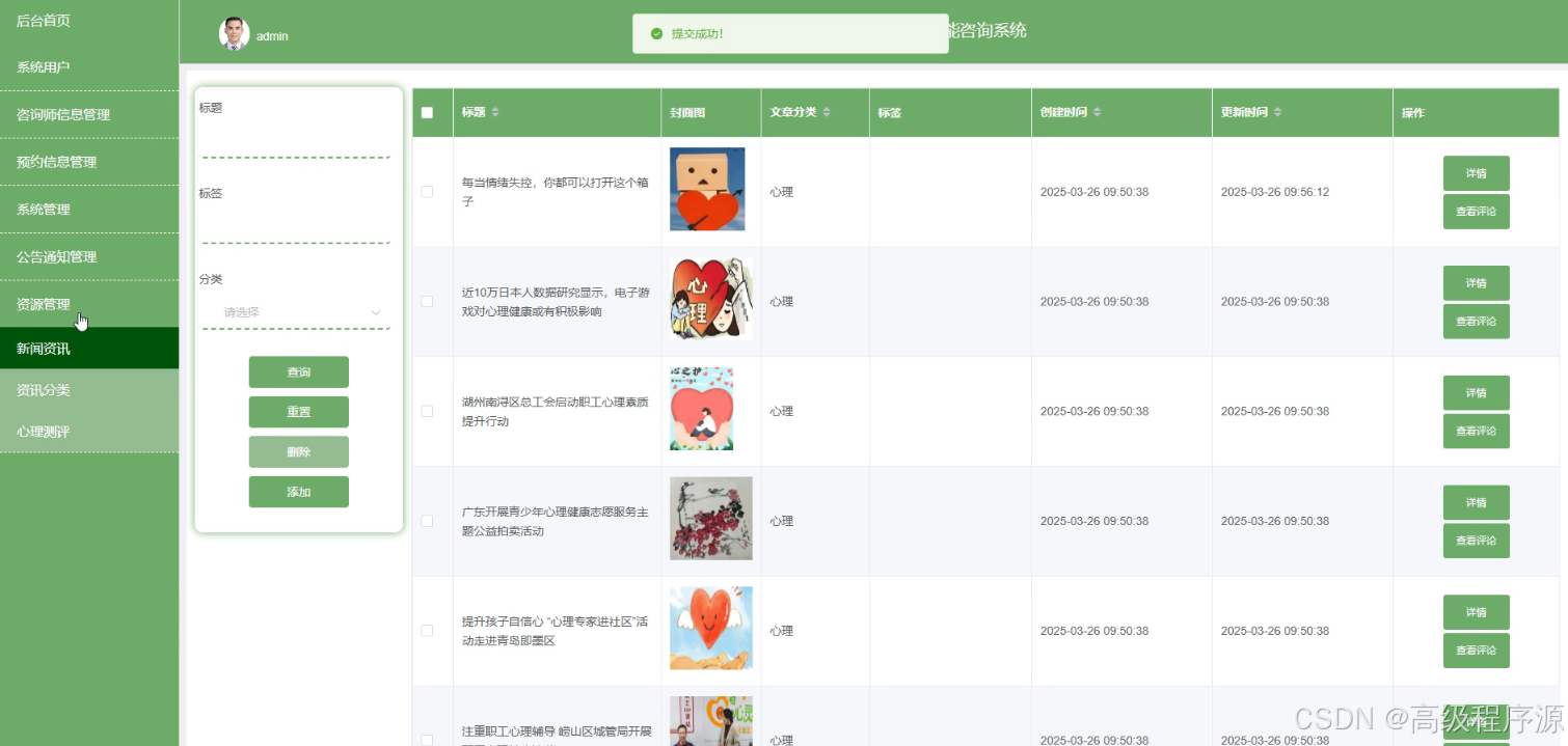 - 资源管理:资源管理整合心理测试题库、新闻资讯及分类标签。管理员可上传心理测试题,发布或删除心理健康相关新闻,维护资讯分类。支持查看资源详情及用户评论,对不当内容进行删除或屏蔽处理。