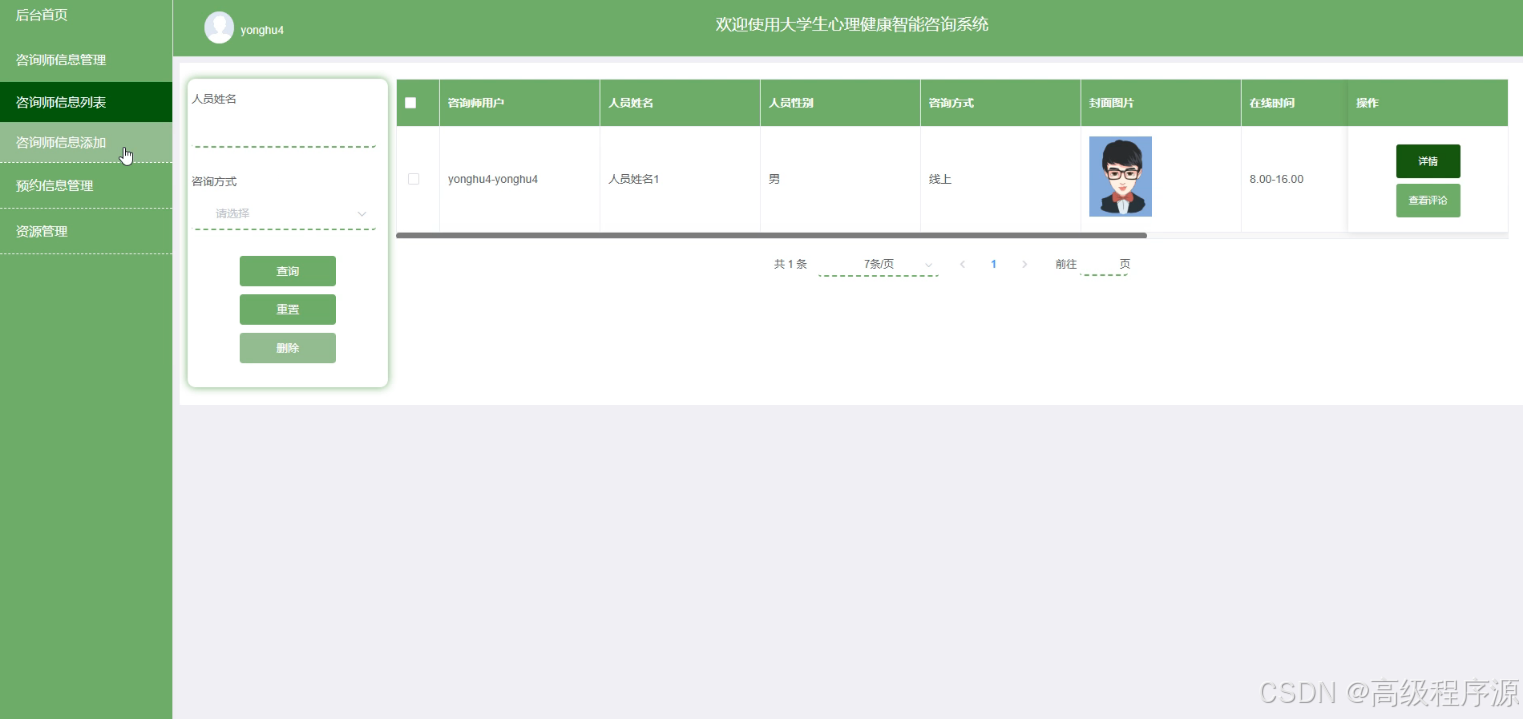 - 咨询师信息管理:此模块允许咨询师用户进行咨询师信息的添加、删除和查询操作。咨询师用户可以查看详细资料。还可以查看用户对咨询师的评论,以评估服务质量。