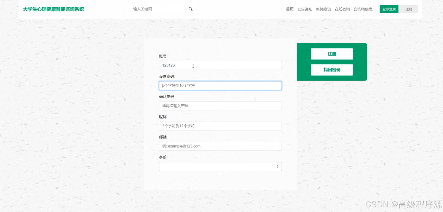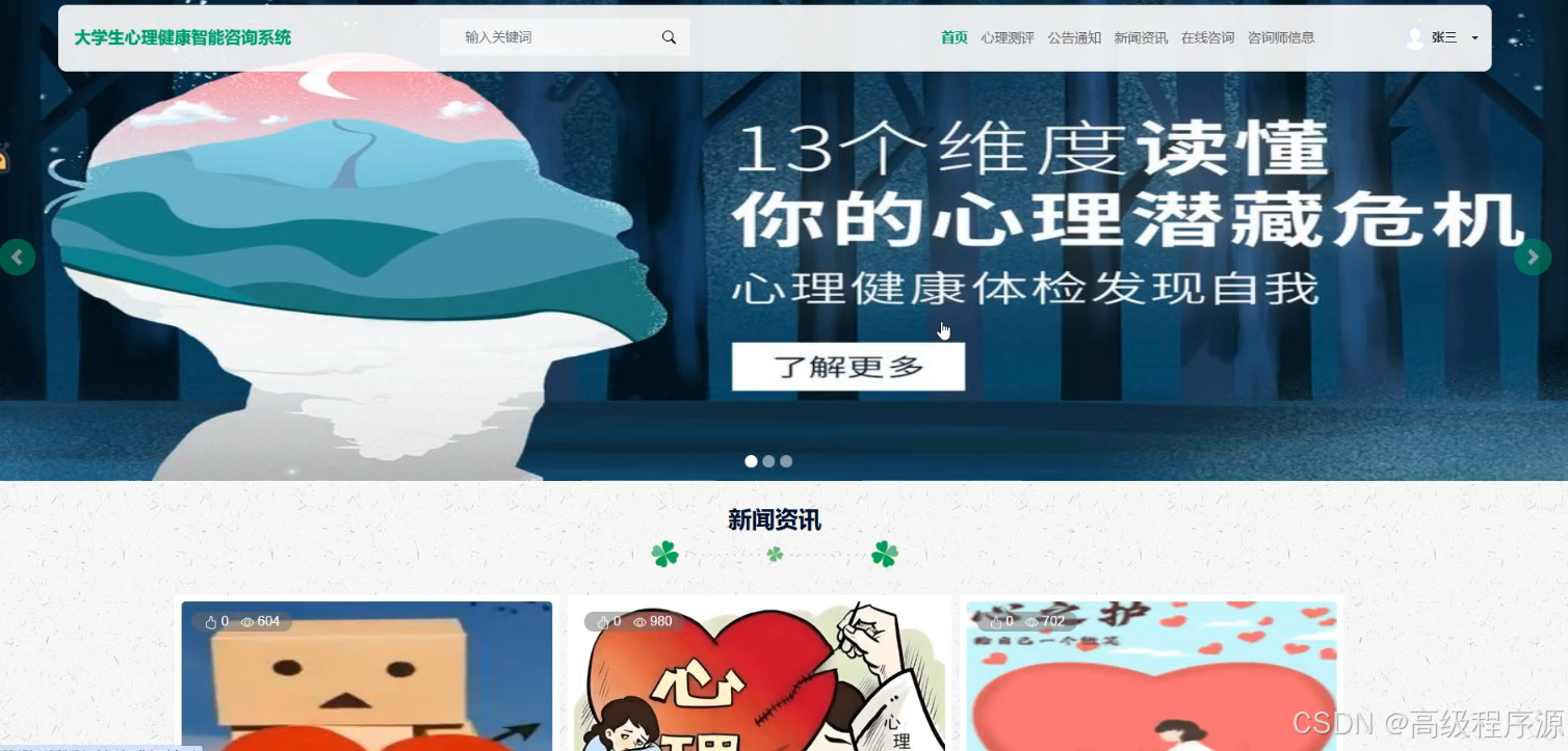 This system is designed and developed based on the SpringBoot framework, and builds an intelligent consultation service platform according to the mental health needs of college students. The system adopts B / S architecture, combines JAVA language and MyBatis-Plus data persistence layer technology to realize multi-role collaborative management mode, including three functional modules: student user, consultant user and administrator. Student side provide psychological assessment, AI intelligent quiz, online consulting, consultant appointment, news and information interaction, such as core functions, support thumb up collection, comment interaction, consultant side integrated review, assessment appointment bank management, online consulting reply and other professional services, management through the authority control, complete the user management, resource maintenance, announcement, system level operation, build a complete mental health service ecosystem.