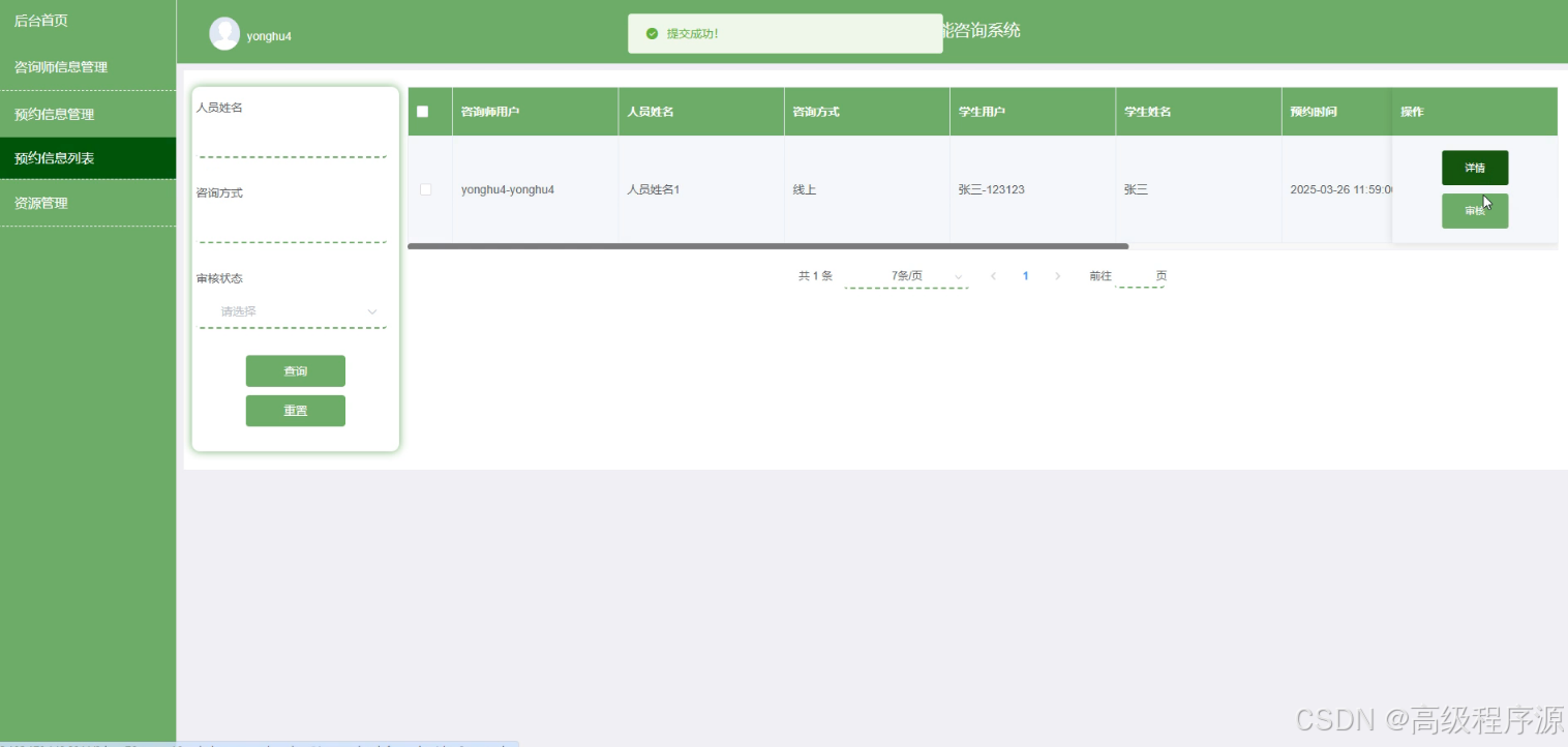 - 预约信息管理:在预约信息管理模块中,咨询师用户可以查询所有预约情况,并查看每个预约的详细信息。咨询师用户还可以对预约进行审核,以确保咨询师的时间表合理安排,并且服务预约符合规定。