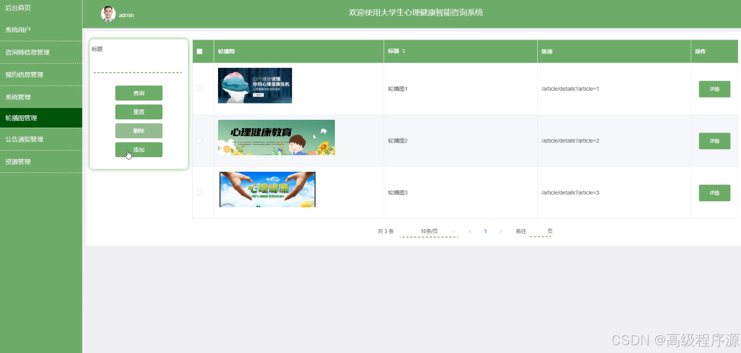 - 系统管理:系统管理中的轮播图模块允许管理员上传、删除或调整首页轮播图的展示顺序,设置图片跳转链接。支持按标题或状态查询轮播图,编辑时需填写图片描述、有效期等详细信息,确保页面内容及时更新。