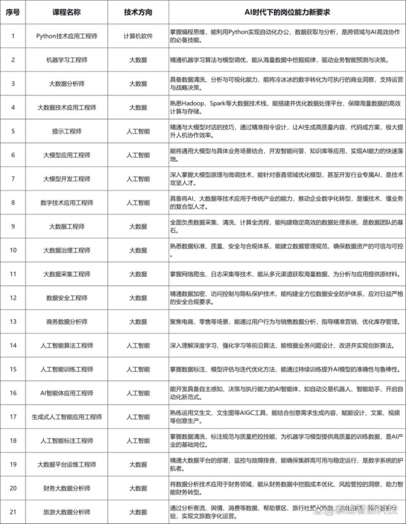 (1)人工智能训练工程师:负责模型的训练、调优和评估,确保模型性能,是连接数据和算法的关键桥梁。满足人工智能、互联网、智能制造、金融等多行业对高质量AI训练专业人才的需求。