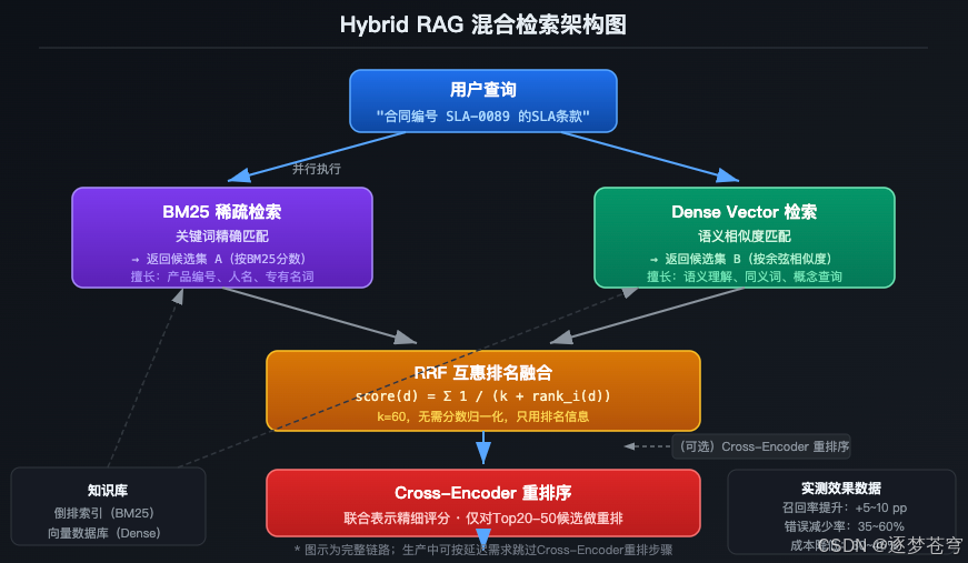 用户查询 ├── BM25 稀疏检索(关键词精确匹配) │ └── 返回候选集 A(按BM25分数排序) └── Dense Vector 检索(语义相似度) └── 返回候选集 B(按余弦相似度排序) ↓ RRF 互惠排名融合 / 加权分数合并 ↓ Cross-Encoder 重排序(可选) ↓ LLM 生成