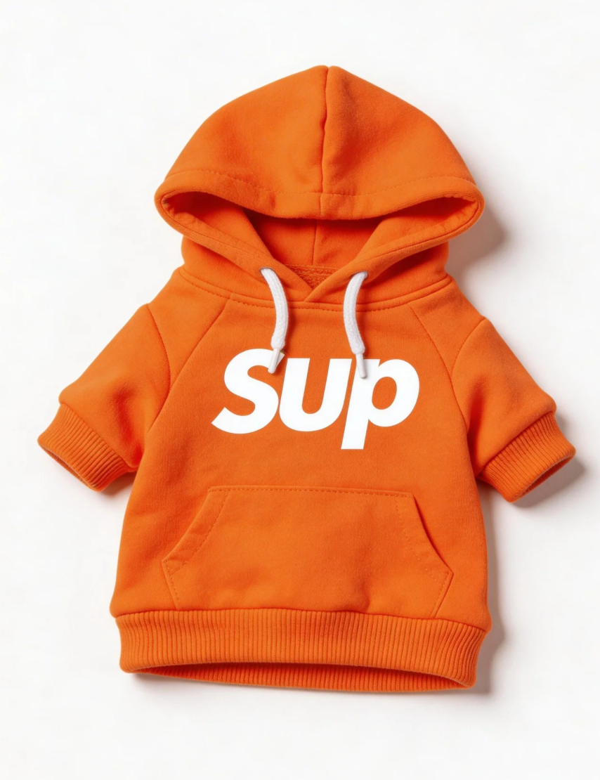 一只胖乎乎的柴犬吉祥物,拟人化站立,穿着一件带有品牌Logo的亮橙色潮牌连帽卫衣,戴着墨镜。酷炫街头风,3D皮克斯动画质感,盲盒手办光影,背景纯色。