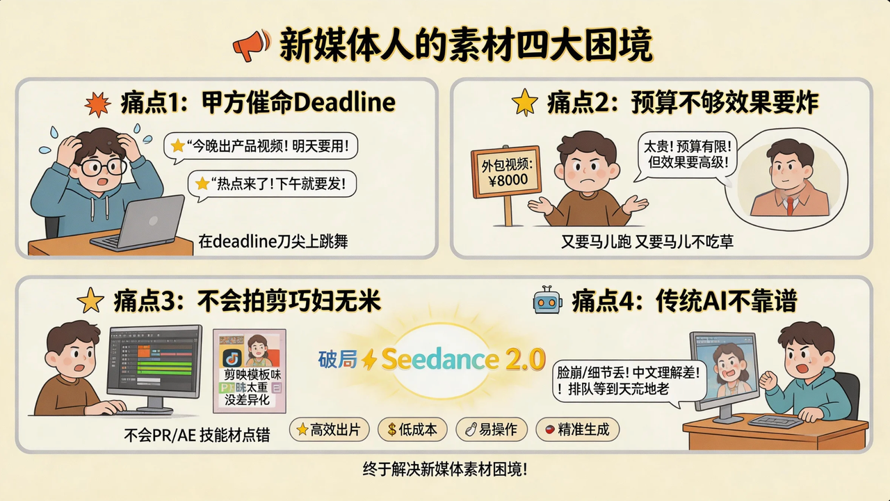 今天这篇文章,阿娜就来详细回答:新媒体人用哪款AI软件做宣传素材?为什么我的答案是Seedance 2.0?它到底能帮新媒体人解决什么问题?
