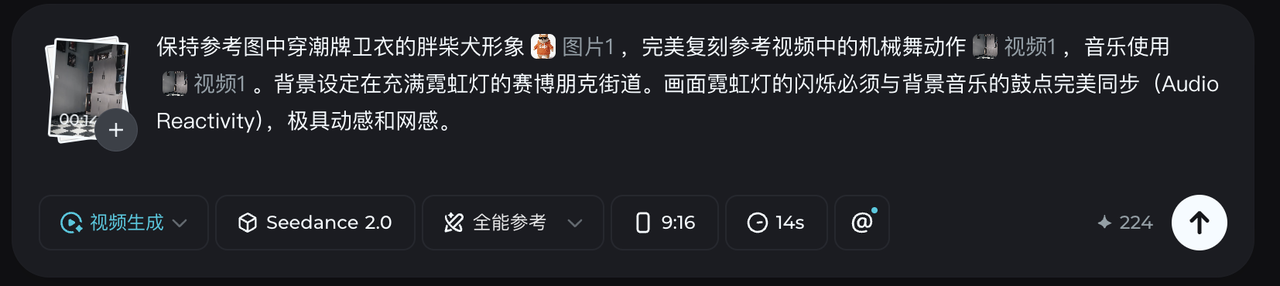 打开即梦,选择视频生成 → Seedance 2.0 → 全能参考入口。 把刚才的柴犬图(定长相)、真人跳舞视频(定动作)、热门音频(定节奏)一股脑全传上去。