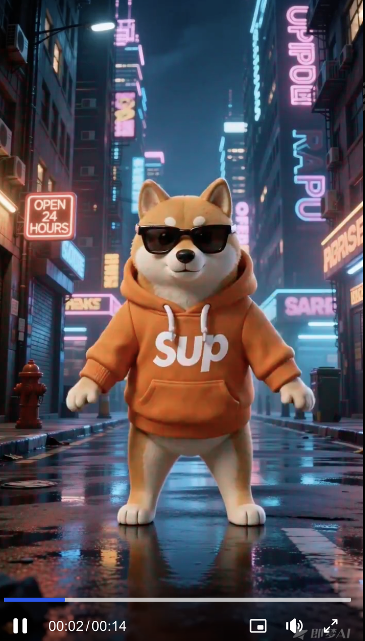 保持参考图中穿潮牌卫衣的胖柴犬形象,完美复刻参考视频中的机械舞动作。背景设定在充满霓虹灯的赛博朋克街道。画面霓虹灯的闪烁必须与背景音乐的鼓点完美同步(Audio Reactivity),极具动感和网感。