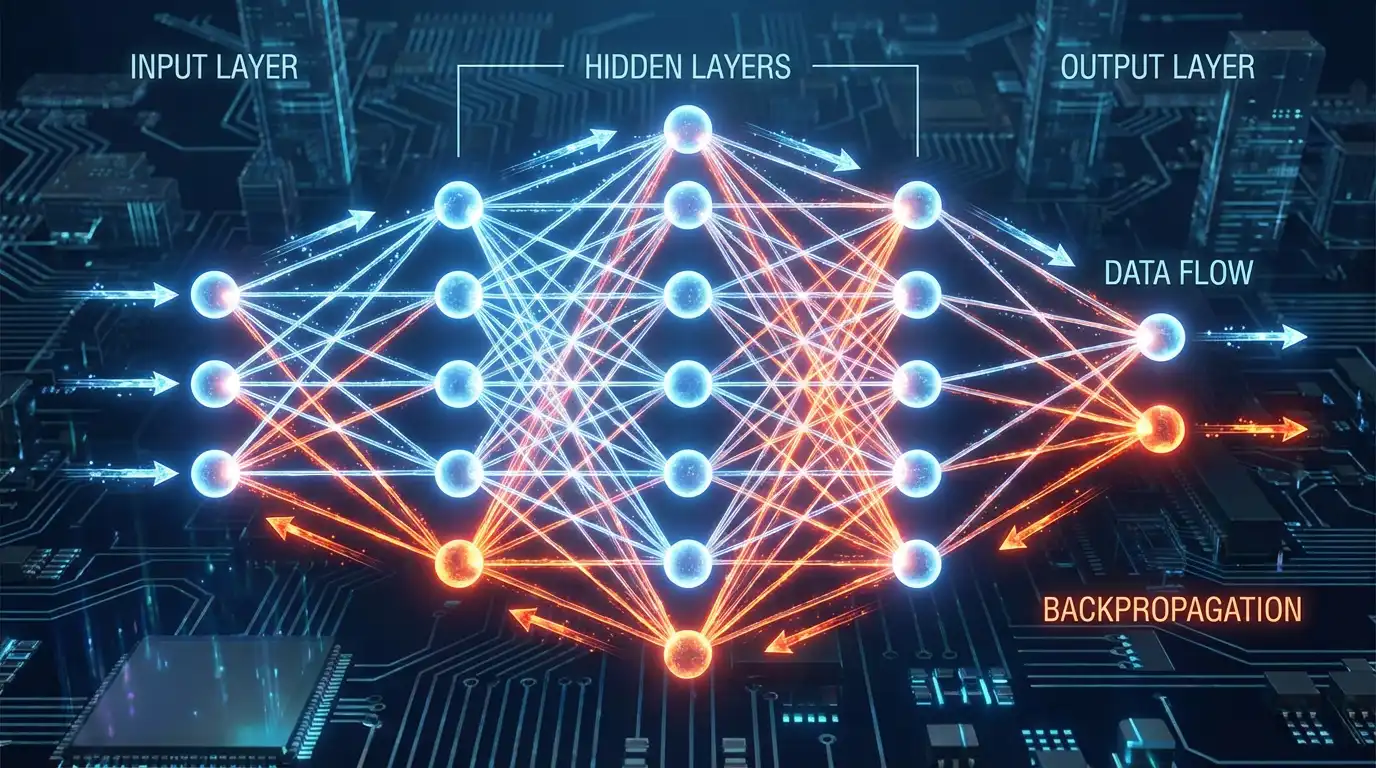 我指着代码里的 layer1, layer2, layer3 说:“看到这些层了吗?这就是深度的由来。现在的模型,比如GPT-4,这种层数可能有几百上千层,参数有万亿个。数据在这些层之间层层传递,就像人类大脑处理信息一样,从‘看到一个黑点’到‘认出这是我家的猫’,瞬间完成。”