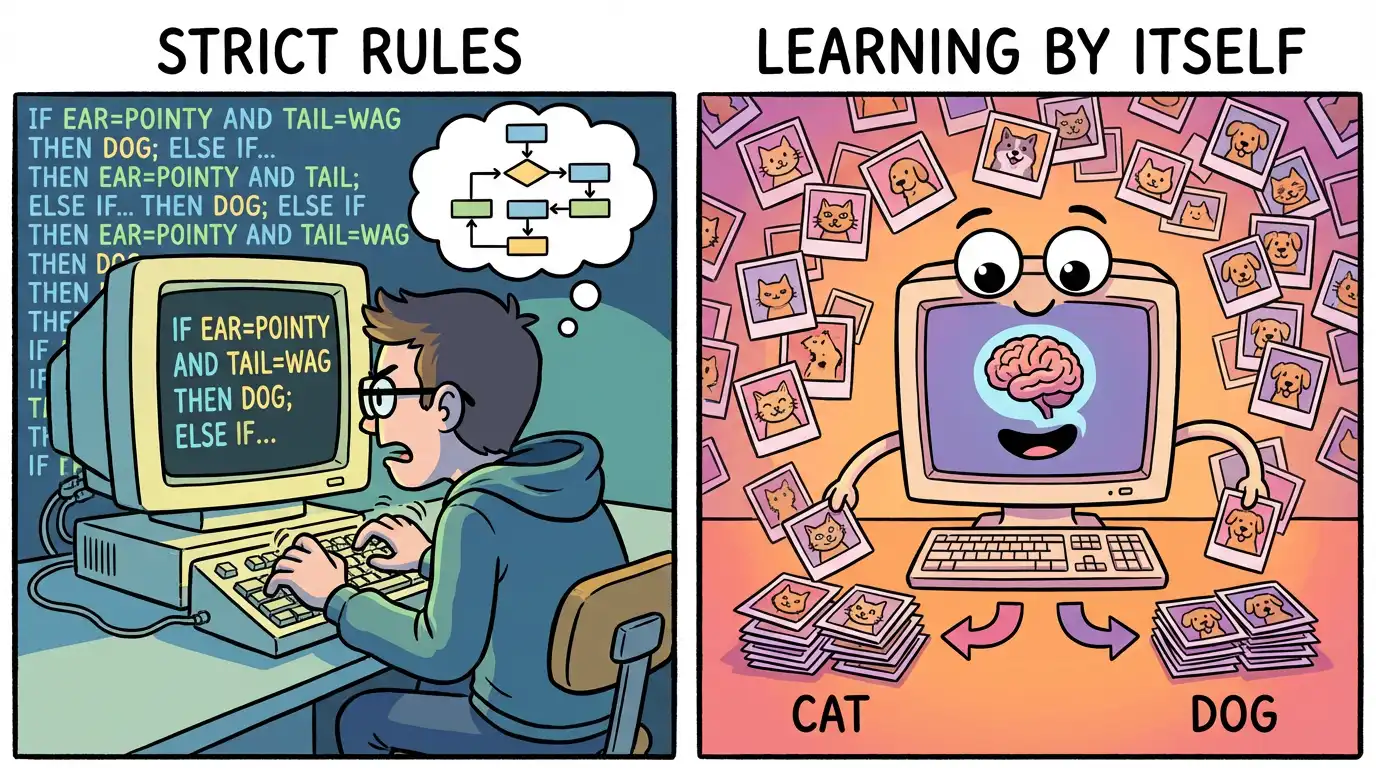 “机器学习就像教小孩。我不告诉它规则,我直接甩给它一万张猫的照片和一万张狗的照片,告诉它哪些是猫,哪些是狗。然后让它自己去‘悟’出规律。传统编程是人给机器下指令,机器学习是机器从数据中找规律。”