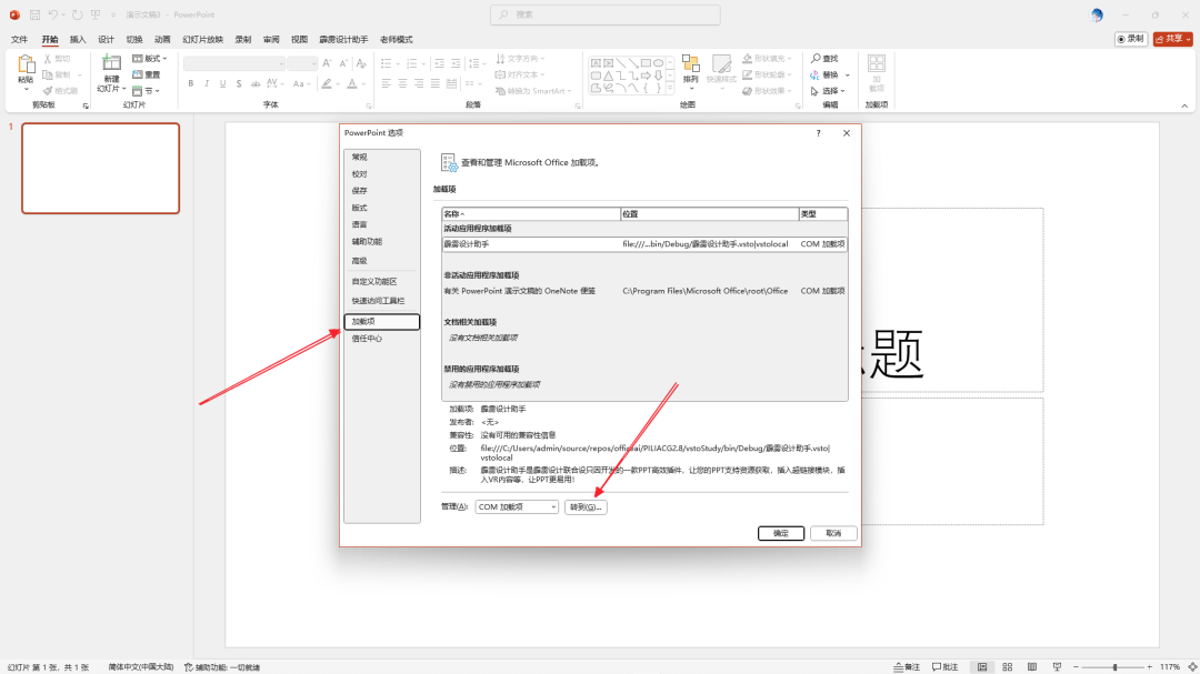 Office 软件配置① 打开 PPT,点击顶部菜单栏的文件,在左侧菜单中选择选项;② 在弹出的 “PowerPoint 选项” 窗口中,点击左侧的加载项;③ 查看窗口底部的 “管理” 选项,选择COM 加载项,点击右侧的转到按钮;④ 在 COM 加载项窗口中,找到霹雳设计助手的加载项并勾选,点击确定后,重启 PPT 即可看到插件菜单栏。