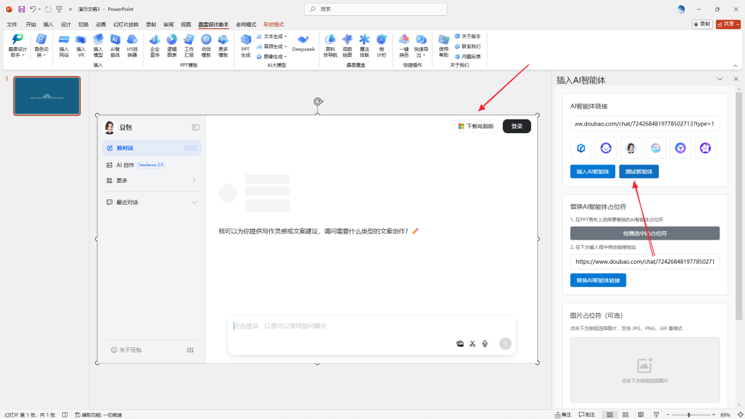 插入并调整好占位符后,建议先测试智能体的交互效果,确保其能在 PPT 中正常使用: