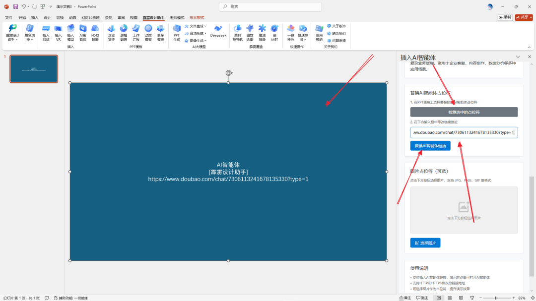 在实际制作 PPT 的过程中,可能会遇到智能体链接填错、需要更换其他智能体的情况,若直接删除占位符重新插入,会浪费调整尺寸和排版的时间。霹雳设计助手提供了替换 AI 智能体链接功能,无需删除原有占位符,即可快速更换智能体,具体操作步骤如下: