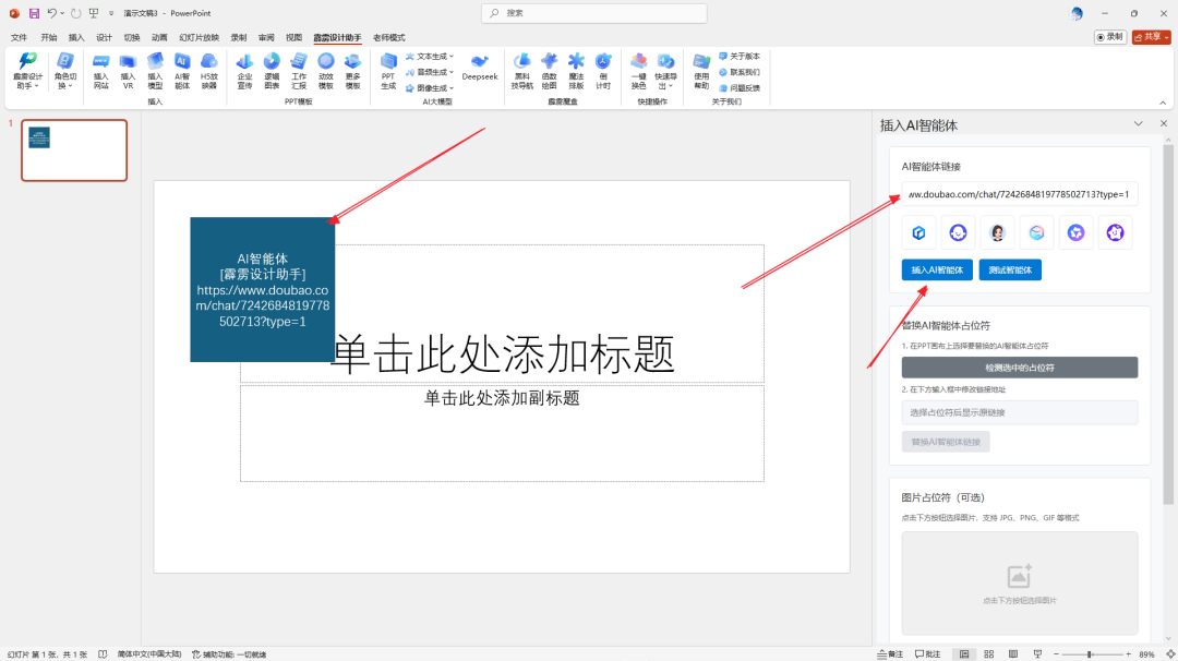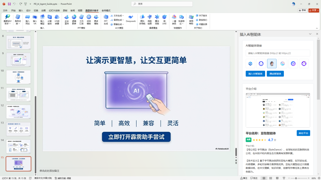 打开需要嵌入 AI 智能体的 PPT 文档,在顶部菜单栏中找到霹雳设计助手,点击展开后,在插入选项卡中选择AI 智能体功能,打开智能体插入界面;