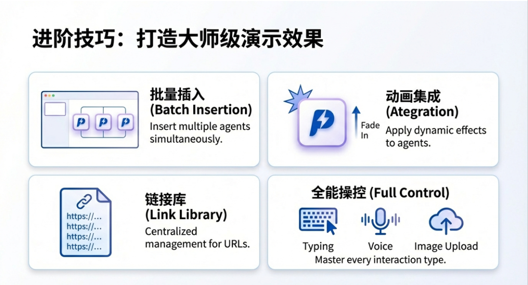 :在技能分享、经验交流的 PPT 中,嵌入实用的 AI 智能体链接,为听众提供实时体验的入口,让分享内容更有价值。