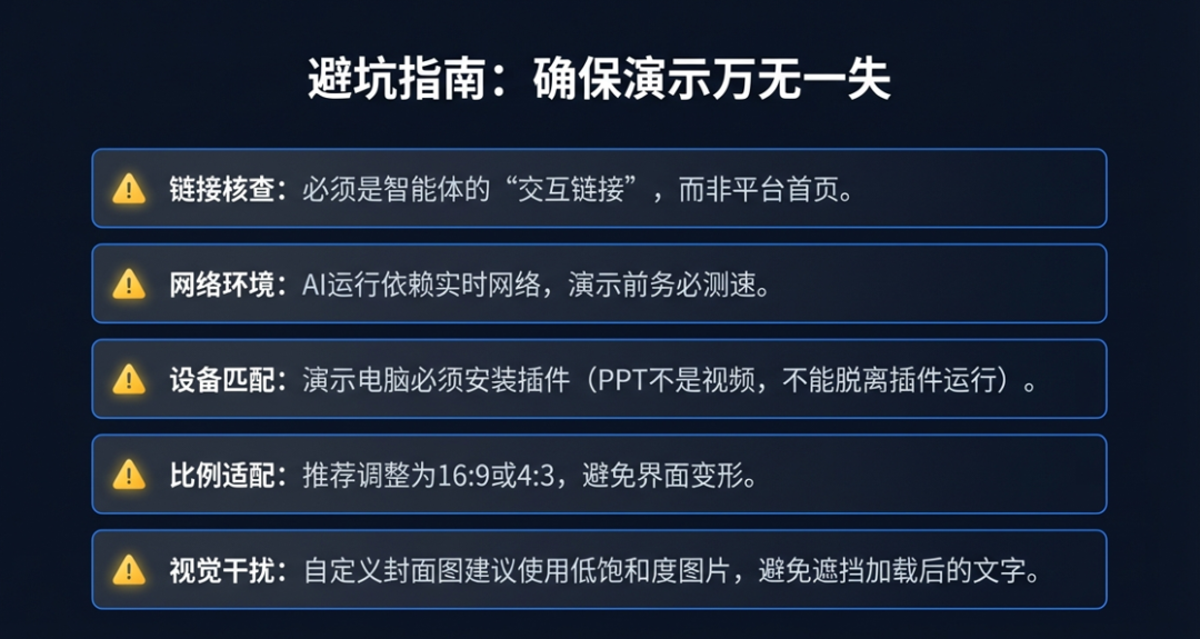 :AI 智能体的加载和交互依赖网络,在 PPT 编辑、测试和放映过程中,需保持电脑的网络连接通畅,避免因断网导致智能体无法使用,建议在演示前测试网络状态,确保演示过程无网络问题;
