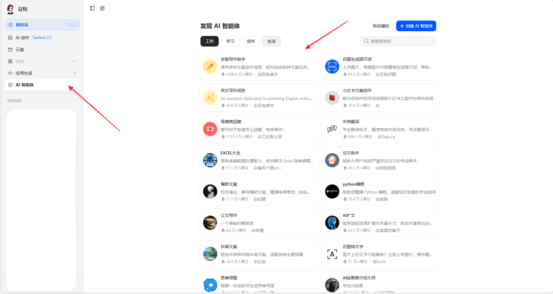 打开豆包官方网站,进入AI 智能体专属页面;