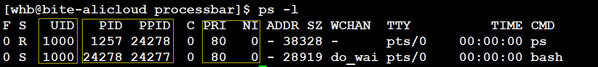 在终端输入ps -l命令,会输出当前终端相关进程的详细信息,其中与优先级相关的核心字段有PRI和NI: