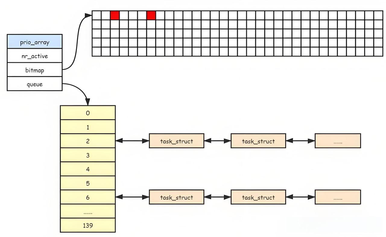 每个prio_array(优先级数组)中包含两个关键组件:queue数组和bitmap位图,用于实现按优先级分组和快速查找。